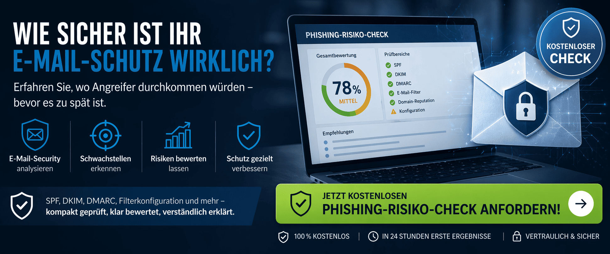 Die meisten Unternehmen erfahren erst nach einem Vorfall, wie durchlässig ihr E-Mail-Schutz tatsächlich ist. Unser kostenloser Phishing-Risiko-Check analysiert Ihre aktuelle E-Mail-Sicherheitskonfiguration – von SPF/DKIM/DMARC bis zur Filterkonfiguration – und zeigt konkret, wo Angreifer durchkommen würden.